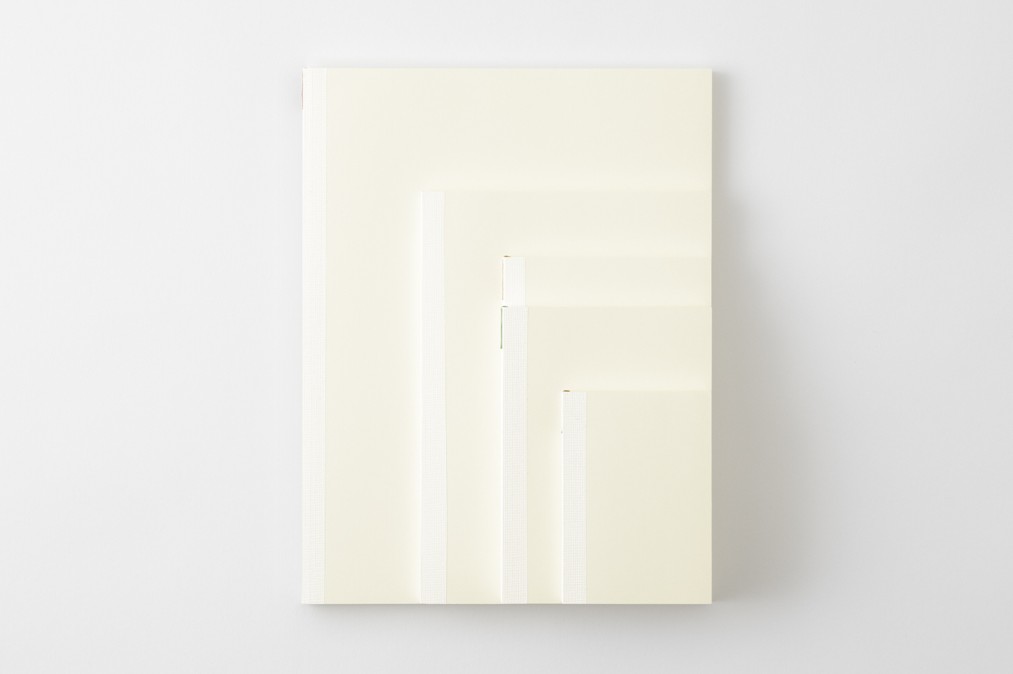 『MDノート』の展開サイズは4種類。本文はそれぞれに無罫・横罫・方眼罫のラインアップがあります(種類によってしおりひもの色が異なり、絶妙なアクセントになっています)。