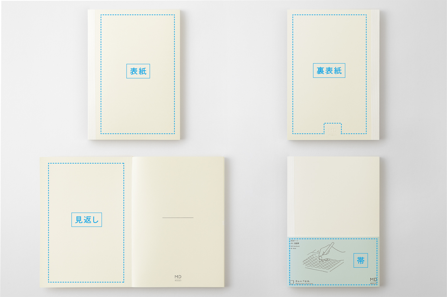 『MDノート』のカスタマイズが可能な場所は、表紙、裏表紙、見返し、帯の4か所です。