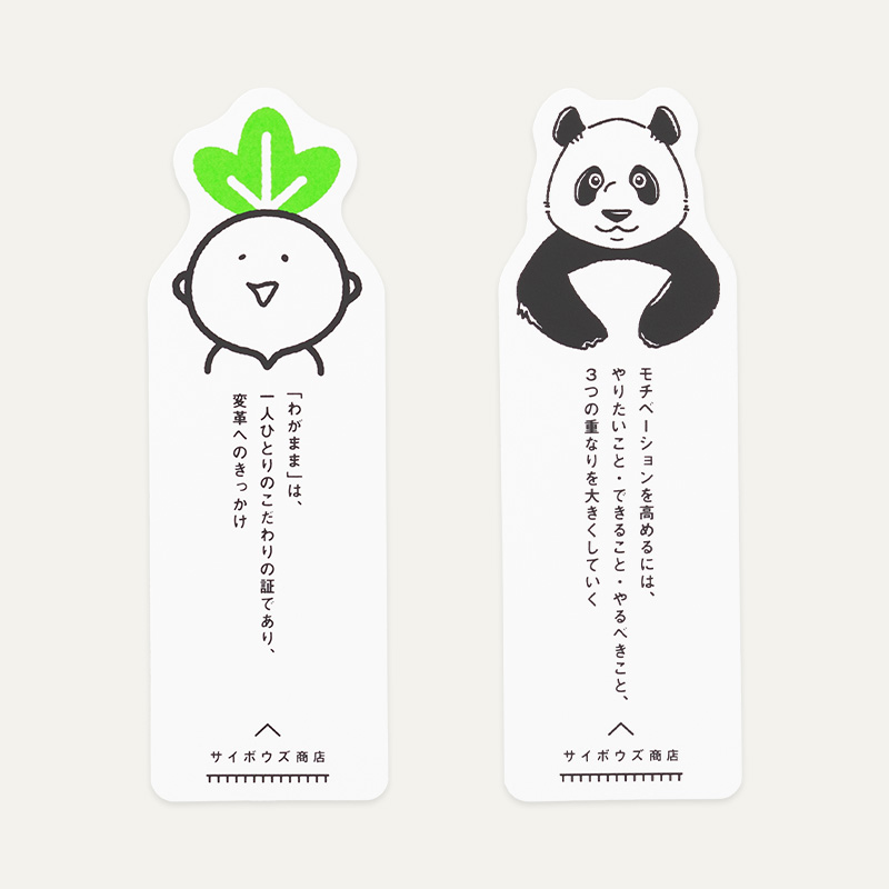 【サイボウズ商店様 事例】kintoneなどのグループウェアで知られるサイボウズ様。チームワークを応援する公式ショップのグッズとして、ブックカバーとしおりを制作しました。ファンの方のアイデアで、企業キャラの「ぶっぱんだ」と「カブボウズ」が顔を出す仕様になっています。