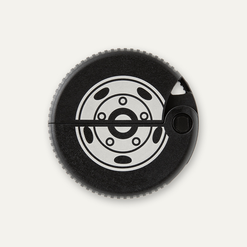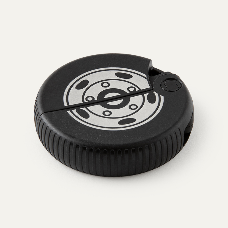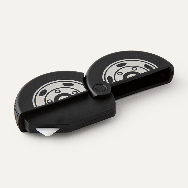 製品の縁の凹凸を活かし、タイヤをイメージしたダンボールカッター。丸い形にぴったりです。