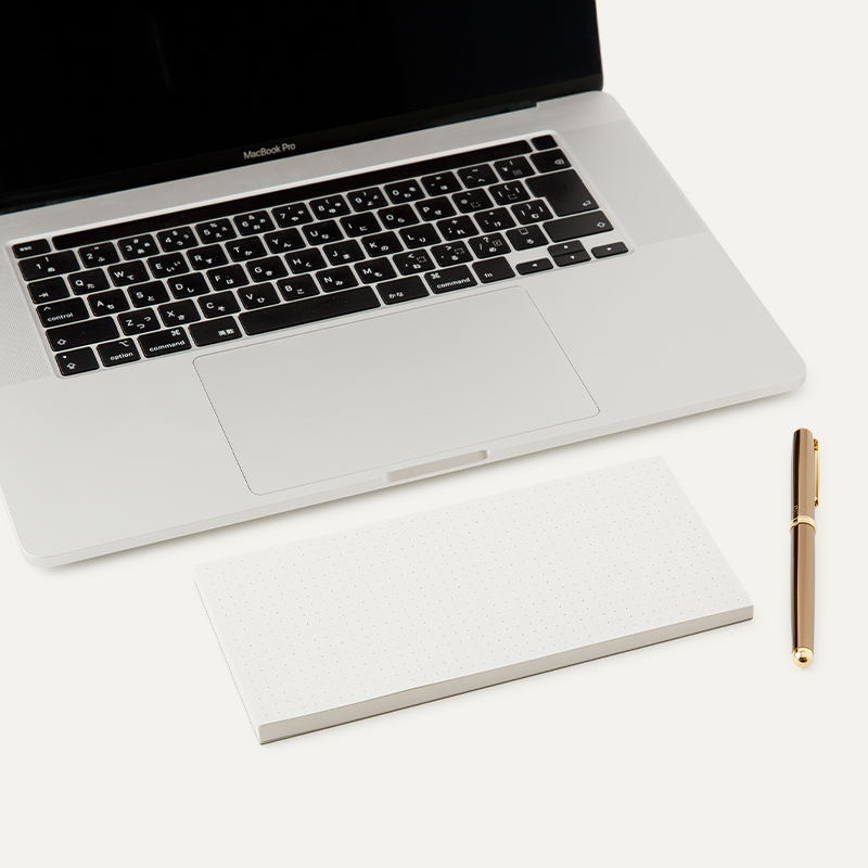 A4の1/3のサイズ感は、ノートパソコンやキーボードの手前にぴったり。テレワーク時の狭いデスクでも書きやすく、持ち運びにも便利なアイテムです。