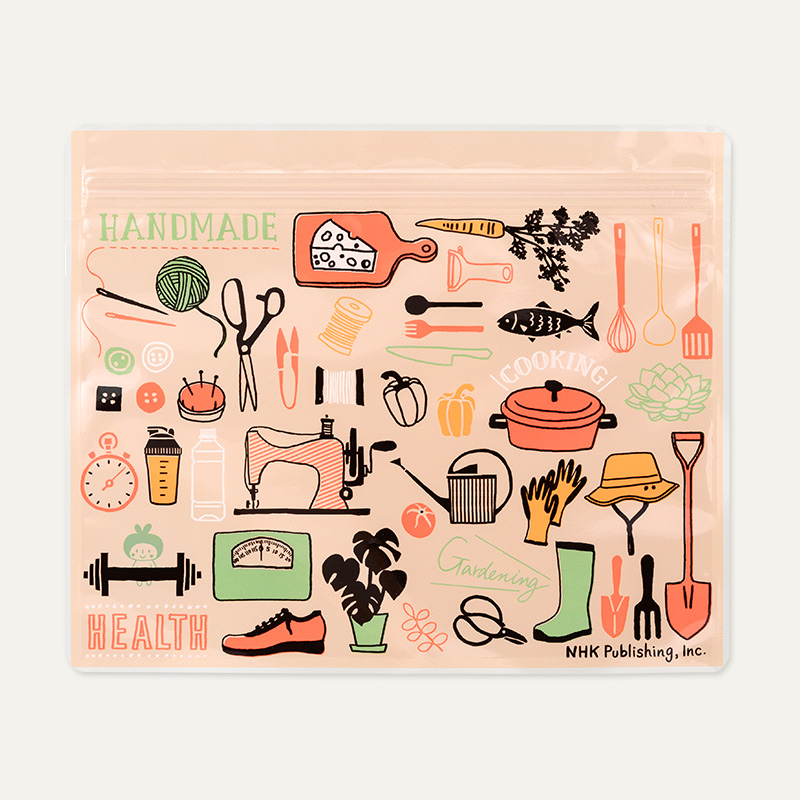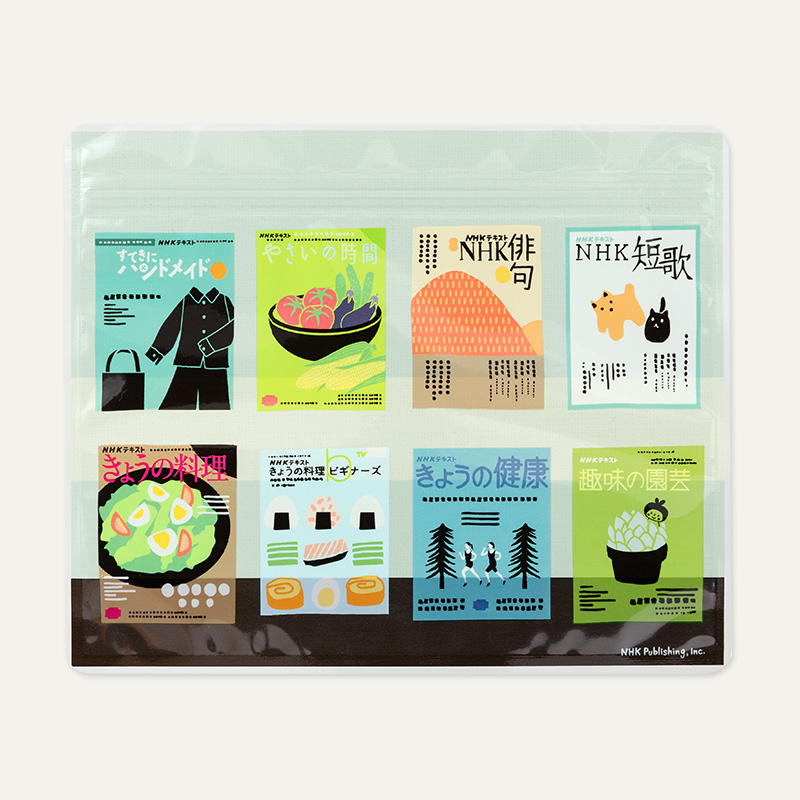 対象誌の定期購読のお申し込みでもらえる、NHK出版オリジナルのジッパー袋。雑誌柄とモチーフ柄がそれぞれ4枚ずつ入っています。