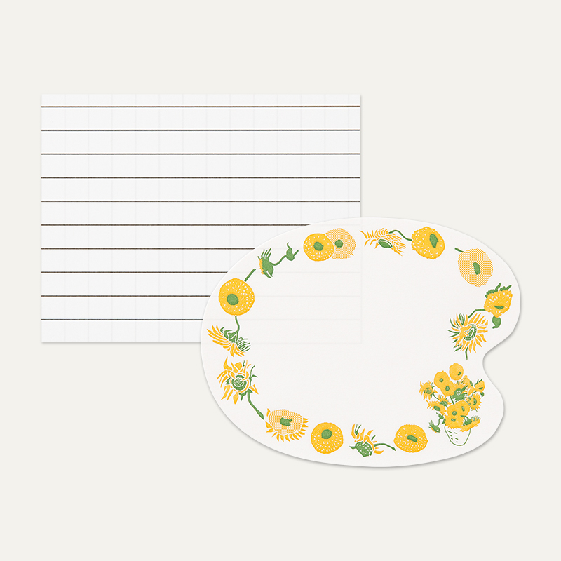 便箋はひまわりをイラストでデザインし、絵の具のパレットをイメージしたダイカットに。