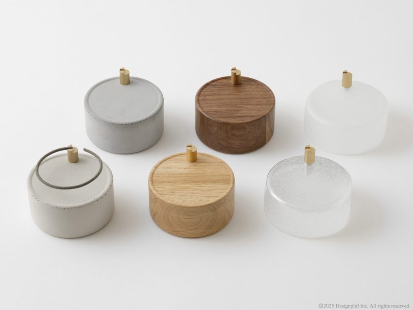 This incense stand combines bases made of mortar, wood, or glass—each highlighting the natural expression of each material—with brass parts that develop a deep patina over time.