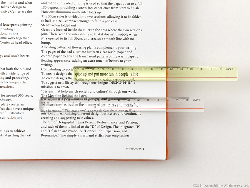 This lens ruler combines a 15 cm ruler with a magnifying glass that can magnify small text approximately 1.5 times. Each line of text-heavy documents can be easily read with the colored guideline. The semicircular ruler is designed so that the whole ruler is a magnifying glass, allowing magnification of a full line of text instead of a single area. The ground point scale makes it easy to measure height and depth, and the size of the text and scale lines are carefully designed so that they will not get in the way when magnifying.