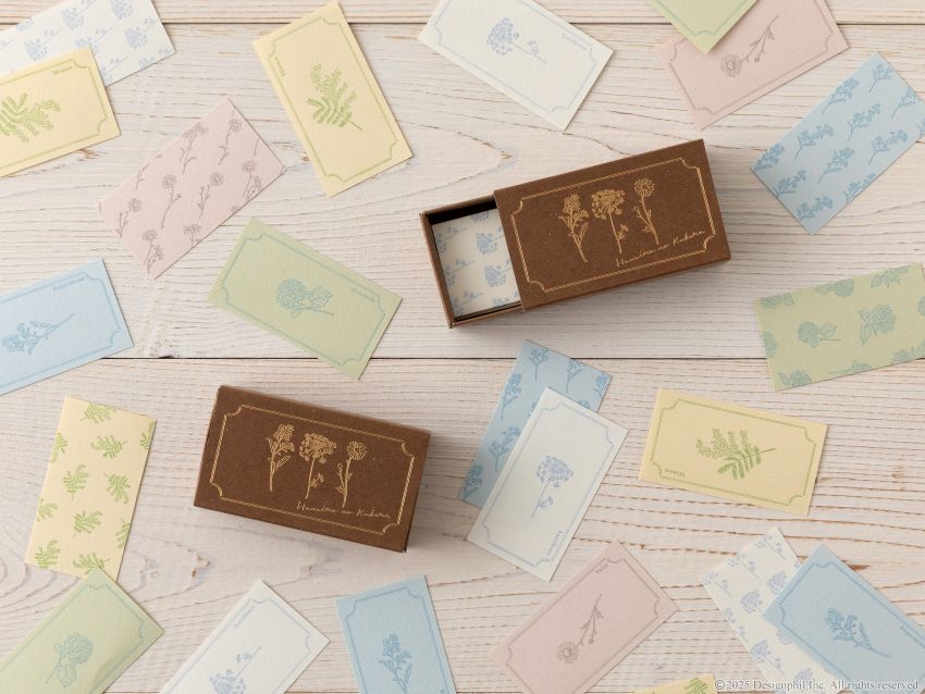 「ミドリ」がオリジナルで抄紙した和紙「DW花色和紙」を使った小さなメモです。白、ピンク、黄、緑、青の5色の小さなメモをアソートして、ミニボックスに入れました。イラストレーターのささきめぐみさんが描いた繊細な花のデザインを、活版印刷で一枚一枚丁寧に表現しました。ちょっとしたお礼や、差し入れに添えるメッセージなどにぴったりです。