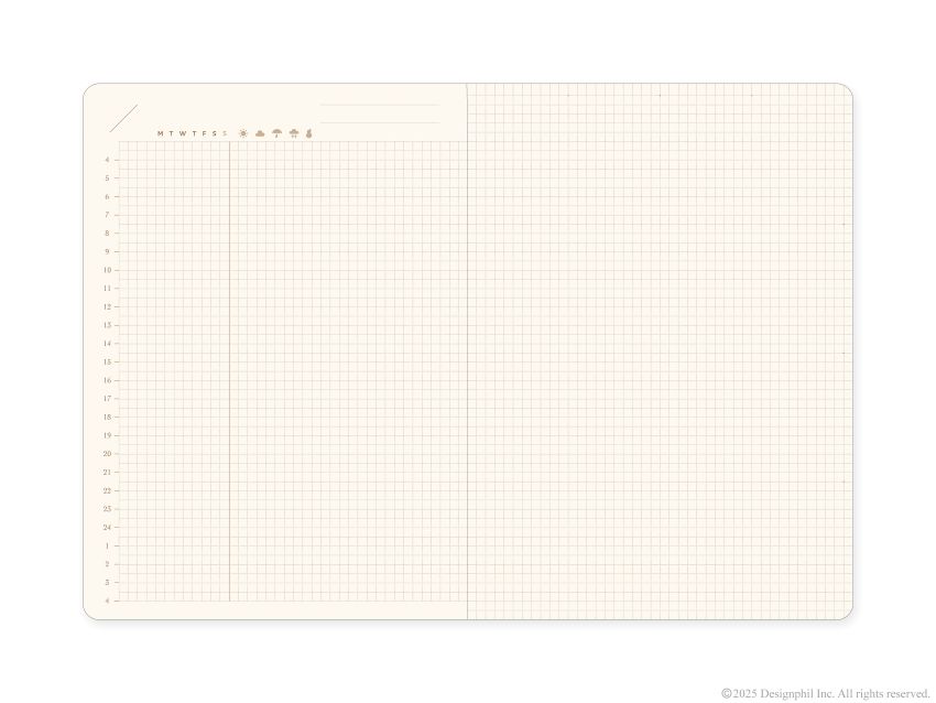 本文ページには、24時間のバーチカル、天気アイコン、書き分けに便利なさりげないガイド線やガイドドットなど、役立つフォーマットがたくさんあるので、書くことに悩まず、記録する楽しさを味わえます。文字を書くときのガイドになる2.5mmの方眼罫は、イラストや図の描き込みにも役立ちます。