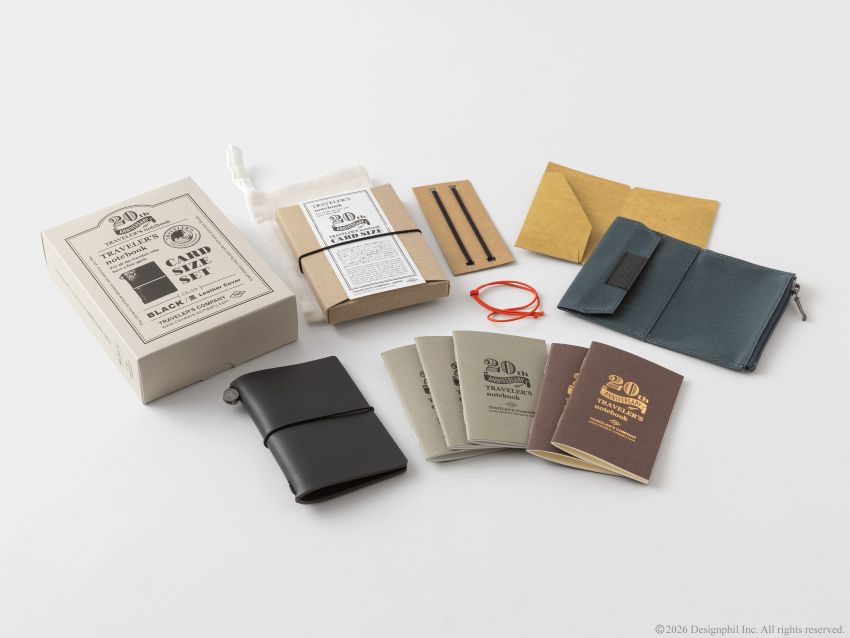 この度、「旅するように毎日を過ごす人のためのノート」をコンセプトに当社が展開する『トラベラーズノート』が、2026年3月に発売20周年を迎えます。これを記念して、カードサイズの『トラベラーズノート』と一緒に使えるアイテムをセットにした『トラベラーズノート カードサイズ 20周年セット』[黒/茶…計2種類、希望小売価格8,800円(税込)]を2026年4月23日(木)に数量限定にて発売します。『トラベラーズノート』のほかに、『ノートリフィル』や『コットンジッパーケース』、『クラフトファイル』、『連結バンド』が入ったスペシャルセットです。旅するときはもちろん、日々の暮らしの中でも、ノートと一緒に旅するように毎日をお過ごしください。